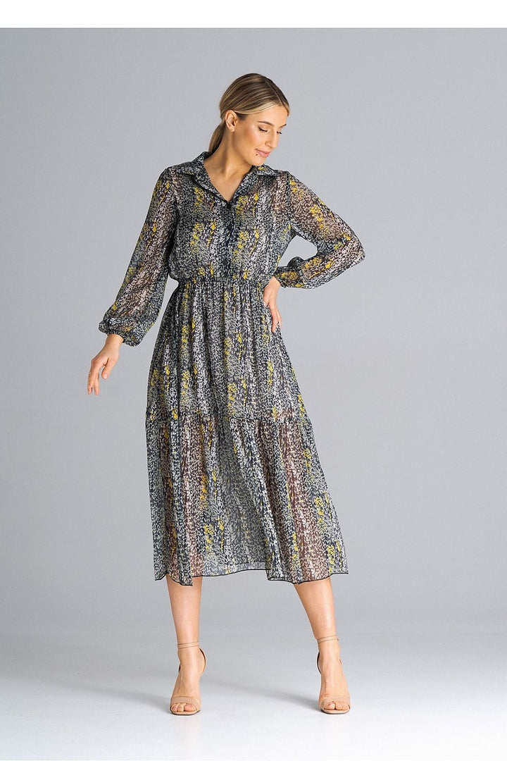 Midi length, flared, lined dress. Dress with long sleeves crinkled with elastic, neckline with collar. The dress is buttoned to the waist, a wide ruffle is sewn at the bottom.