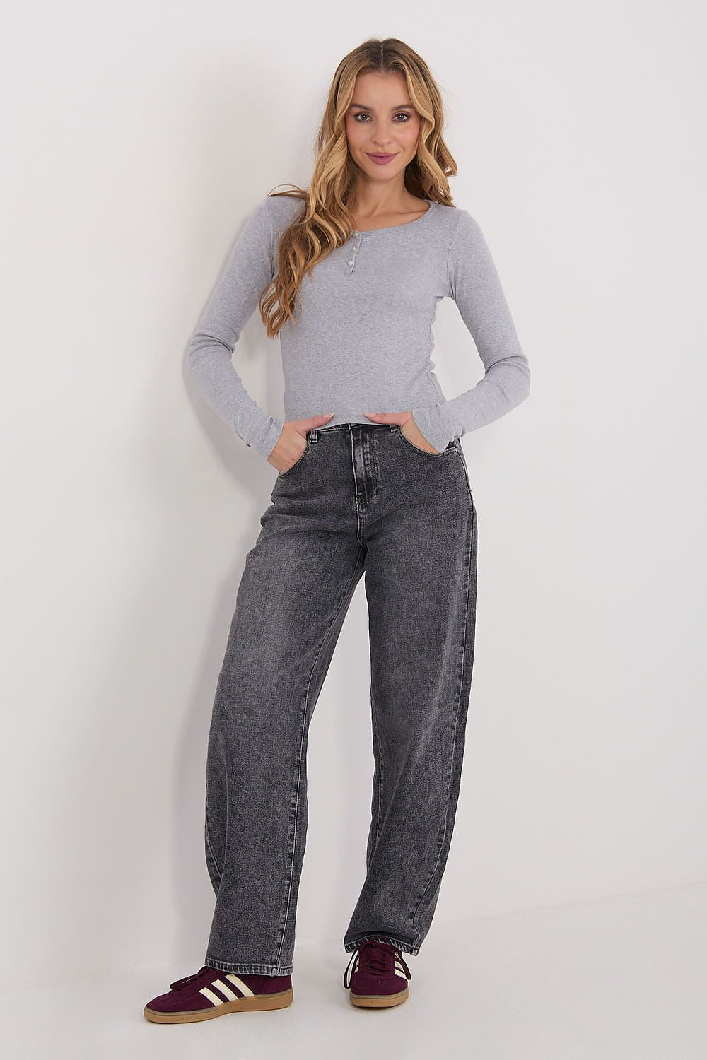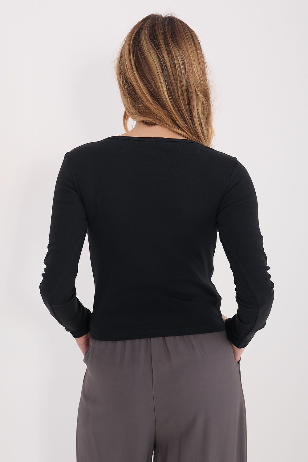The fitted longsleeve blouse is a perfect base for everyday casual styling. The short cut subtly emphasizes the silhouette and pairs well with jeans, fabric pants, or a high-waisted skirt. The model is suitable for both everyday wear and work, combining comfort with a versatile design. The blouse is made of high-quality cotton, which ensures comfort, breathability, and softness to the touch. The smooth pattern gives it a timeless character and makes it easy to create various stylings. The model has long sleeves and a classic, round neckline fastened with three buttons. This subtle detail adds feminine charm to the whole look and allows for gently adjusting the depth of the neckline. This is a practical, stylish, and versatile proposal for any wardrobe.