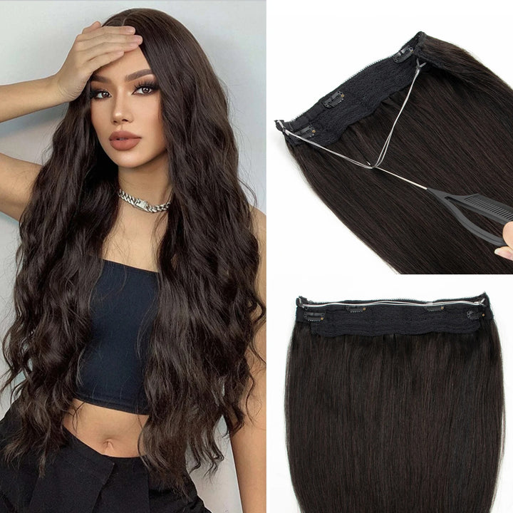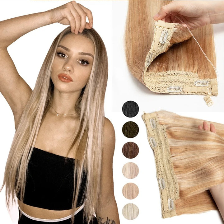 Invisible Wire Line Clip-in Human Hair Extensions - One Piece Straight Blonde Natural Hair Extensions available in lengths ranging from 12" to 24". Each set comes with a fish line and 4 clips for easy application.