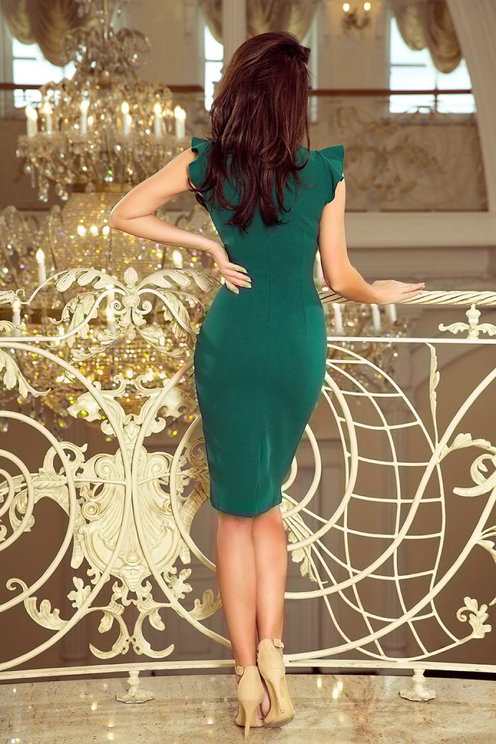 MEGAN Vestido con escote y volantes en hombros, en color verde botella. Producto polaco. Marca nucoco.