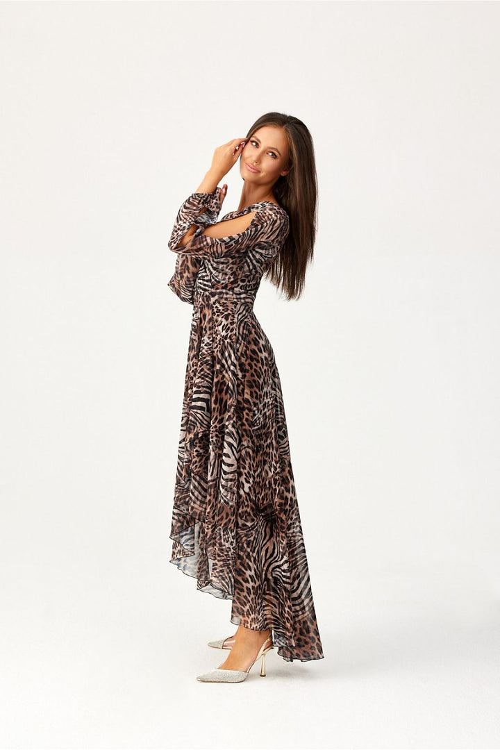 Asymmetrical maxi dress. Flared bottom, top with a draped neckline and amazing long puffy sleeves with decorative slits. Sleeves finished with elastic band. The dress narrowed at the waist will perfectly emphasize the waist area. Fastened at the back with a zipper with a delicate back exposure. The dress has a sewn-in slip, so the material will not be see-through. Just a delicate piece of jewelry and you will dazzle everyone around you. The cut and length will be perfect for every figure, giving the silhouette lightness and visually adding a few centimeters in length. The airy and delicate material will gently wave with every move, leaving an unforgettable impression. The product is made and sewn in Poland.