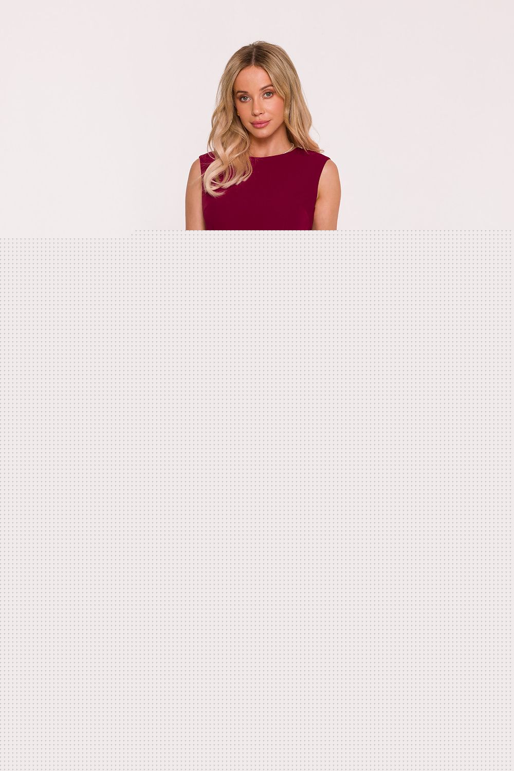 An elegant pencil dress with a peplum is a classic in a modern version. Made of smooth, pleasant to the touch fabric, it beautifully emphasizes the female silhouette, while providing comfort when worn. The model has a delicate, semi-circular neckline and a sleeveless cut, which will work perfectly both in the office and during elegant celebrations. The waist is clearly marked with a belt and a subtle peplum, which optically shapes the silhouette and gently masks the hip and abdominal areas. The bottom of the dress has a fitted pencil cut, which emphasizes the legs and gives the whole a classic character. At the back, there are two concealed zippers, thanks to which the dress fits perfectly to the figure. The whole is complemented by a thin belt in a contrasting color, fastened with a button stylish accent, which adds character. Designed and sewn in Poland with attention to detail and high quality workmanship.