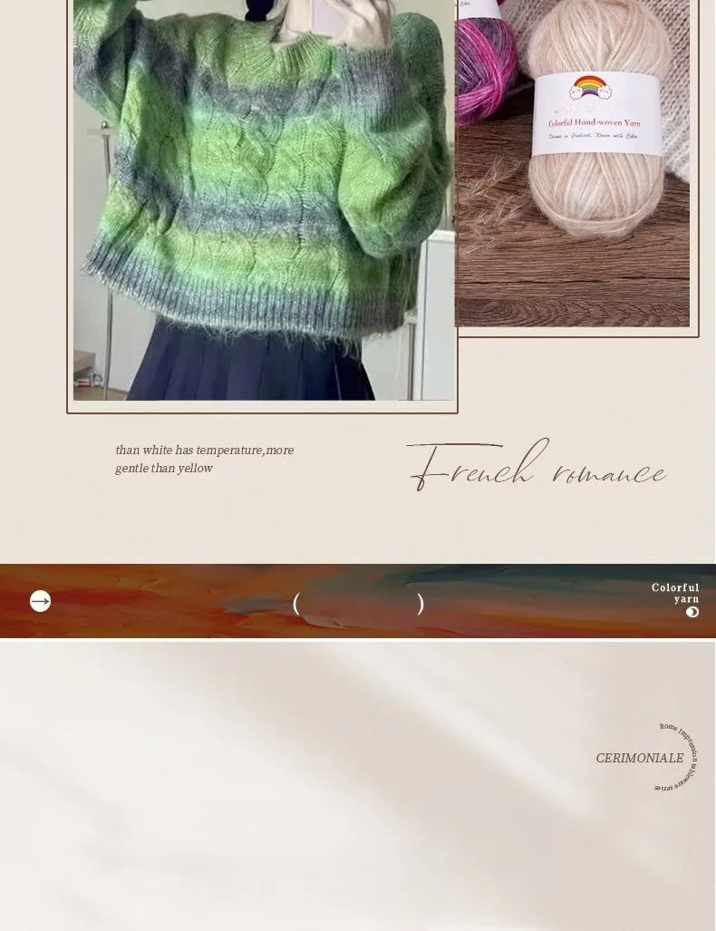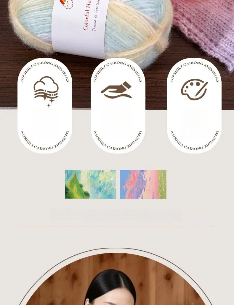 Add vibrant color and softness to your knitting projects with this 150g Mohair Gradient Spray Yarn Set. Featuring a beautiful segment-dyed rainbow gradient, this yarn creates stunning color transitions that make every handmade piece unique and fashionable.