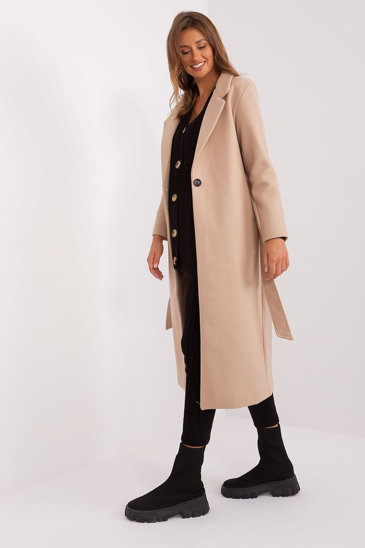 This long transitional coat is ideal for a variety of occasions, from casual to more formal. It is made of durable polyester, which ensures durability and wearing comfort. The long cut perfectly protects against the cold and wind, and the slip pockets are both practical and stylish. The coat is designed in a classic plain pattern, making it versatile and suitable for many looks. The lack of insulation makes it suitable for autumn and spring. The button fastening and tie belt adds elegance, and is suitable for both casual, work and more formal occasions. This coat, made of 100% polyester, is an excellent choice for any season.
