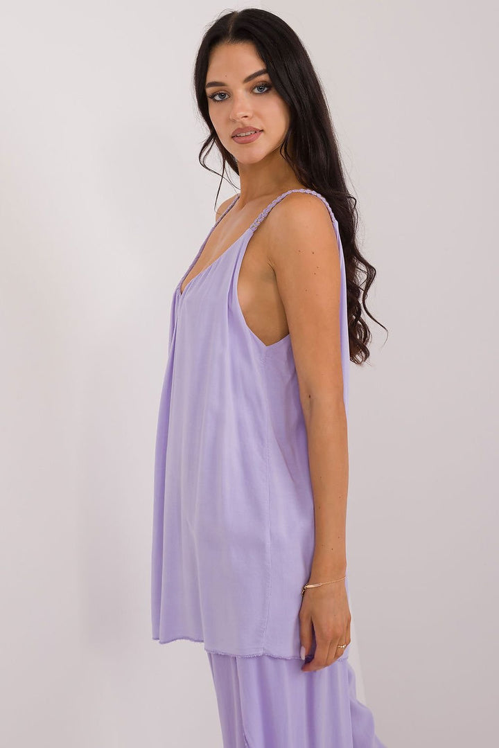 Casual women's blouse, ideal for everyday wear, made of smooth material, the dominant component of which is viscose. It provides comfort and breathability, perfect for warmer days. The blouse has a standard length and is strapless, which adds to its lightness and summer character. It has a round neckline, which subtly exposes the neck. Creases at the neckline add elegance and delicate charm to the blouse. In addition, the blouse is equipped with a lining, which increases the comfort of wearing and provides a better fit. Ideal for everyday styling, combining style with comfort.