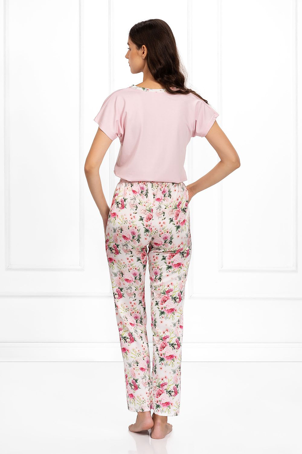 Pyjama pour femme composé d'une blouse et d'un pantalon. Le chemisier a des manches courtes et un décolleté cœur. Pantalon long imprimé à la coupe ample et confortable avec un nœud décoratif.