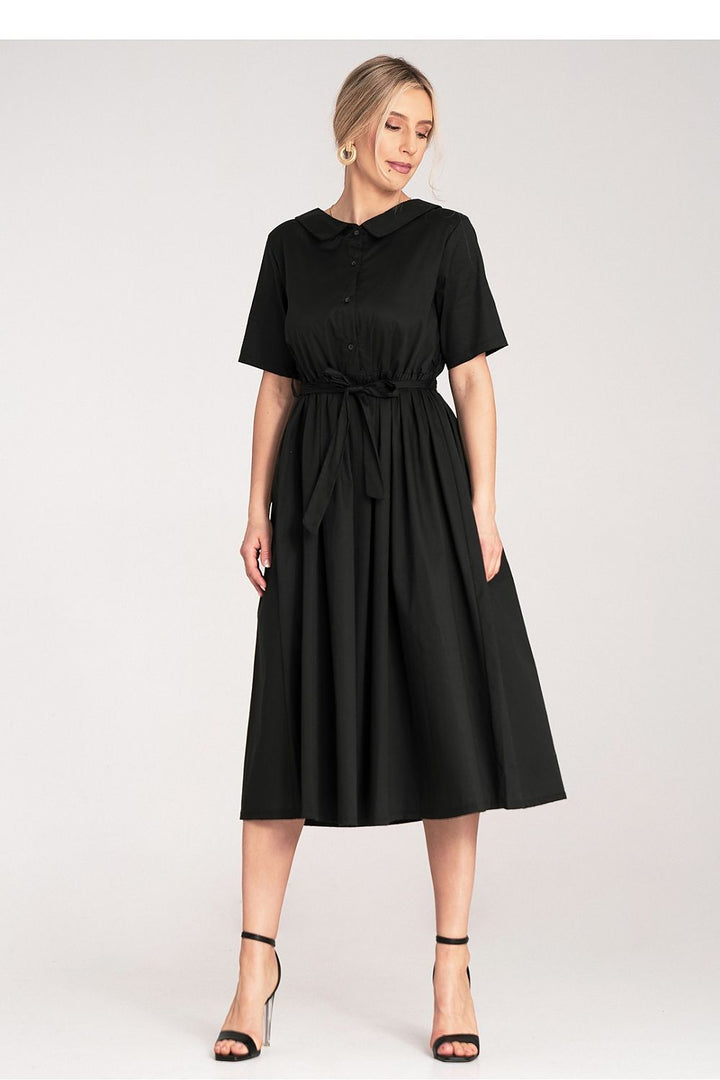 Midi-length dress made of shirt fabric. The top has short sleeves, button closure, and a soft, rounded collar. The dress comes with a belt made of the same material. The flared bottom with small pleats at the back creates a classic A-line silhouette.