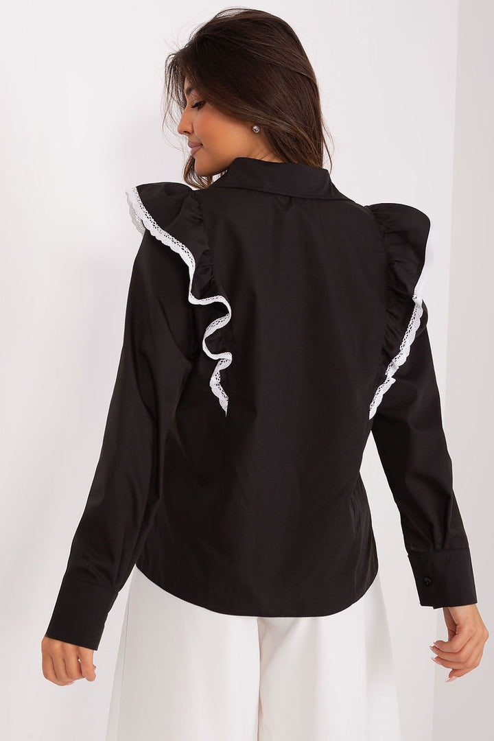 Ideal for a variety of occasions, from work to business meetings or formal events, the classic shirt combines the comfort of a casual style with the elegance of a classic cut. Its cut is versatile, making it perfect for both everyday situations and more formal occasions. Made of high-quality cotton, it ensures not only comfort of wear, but also durability and natural ventilation. The long sleeve and standard length add a traditional touch to the shirt. The collar and button closure add elegance, creating the perfect base for a variety of outfits. Unique details include a decorative ruffle on the shoulders, which adds a subtle lightness to the shirt, giving it a girlish charm. In addition, the decorative lace placed on the frills gives the shirt a unique, delicate character. This fine decoration is an elegant contrast to the plain pattern dominating the rest of the shirt. This classic shirt is a combination of comfort, elegance and subtle details that will make the wearer look stylish and classy, both at work and at more formal events.