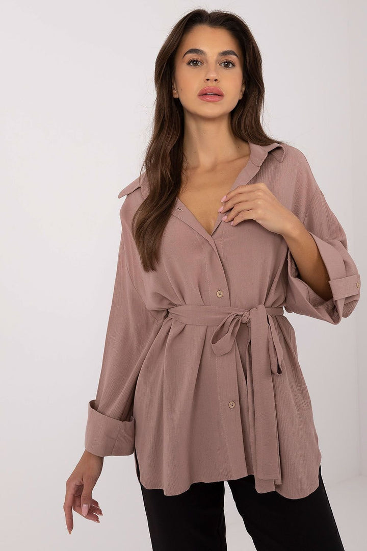 Casual women's shirt, ideal for everyday wear and for work. Made of smooth, monochromatic material, the dominant component of which is cotton, it provides comfort and breathability. It has a classic collar and 3/4-length sleeves, which adds to its casual yet stylish character. The standard-length, button-down shirt additionally features a tie belt, which accentuates the waist and adds a feminine touch. It is a versatile proposition, ideal for casual styling, combining comfort with classic style.