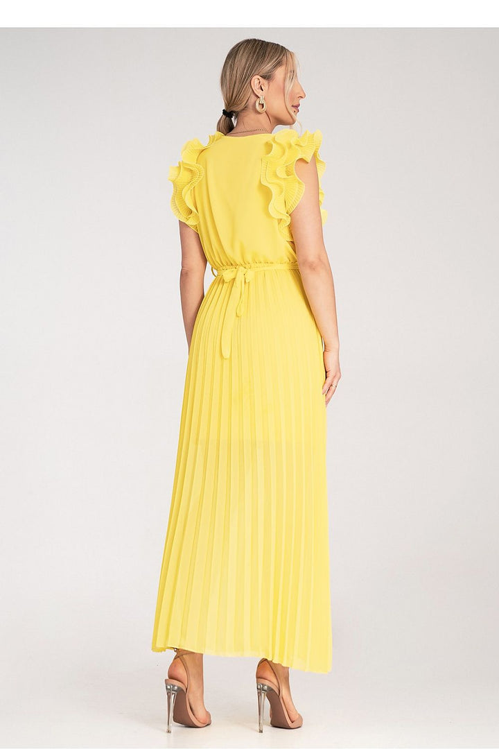 Maxi dress with a wrap neckline and decorative, double ruffles on the shoulders. Elastic band and fabric belt for tying at the waist. The bottom is long, with small pleats, made of lightweight, semi-transparent fabric.