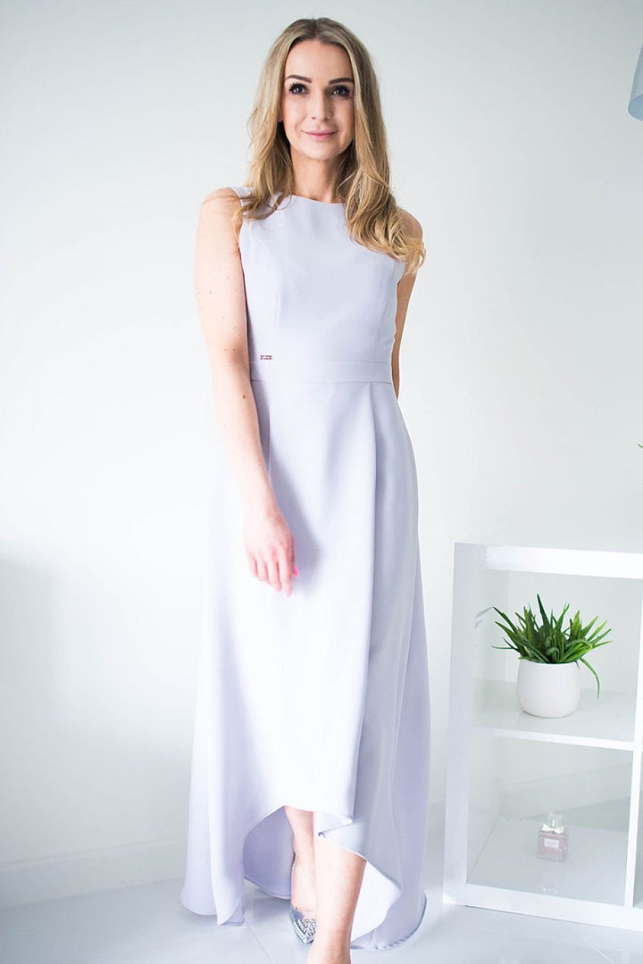 Simple yet elegant dress with zipper at back. Dress is lined, with a fitted top cut off at the waist. Dress in maxi length, longer back, shorter front. Ideal for many occasions.